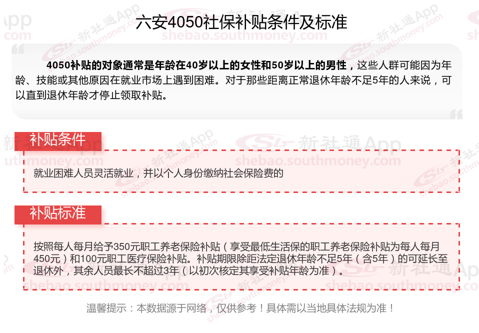 4050补贴主要是针对大龄就业困难人群的社保补贴,申请条件包括年龄、就业困难、灵活就业并自费缴纳社保,需要持有失业登记证,不同地区可能有细微差别,比如农村户口的限制。那么六安4050灵活就业社保补贴标准是多少钱?六安4050社保补贴条件是什么?接下来随新社通APP小编了解一下最新资讯。