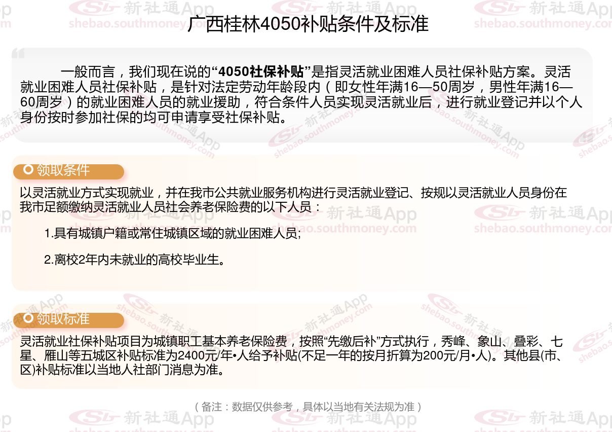 2025广西桂林灵活就业4050社保补贴是一项面向特定年龄段的就业困难人群的社会保险补贴。