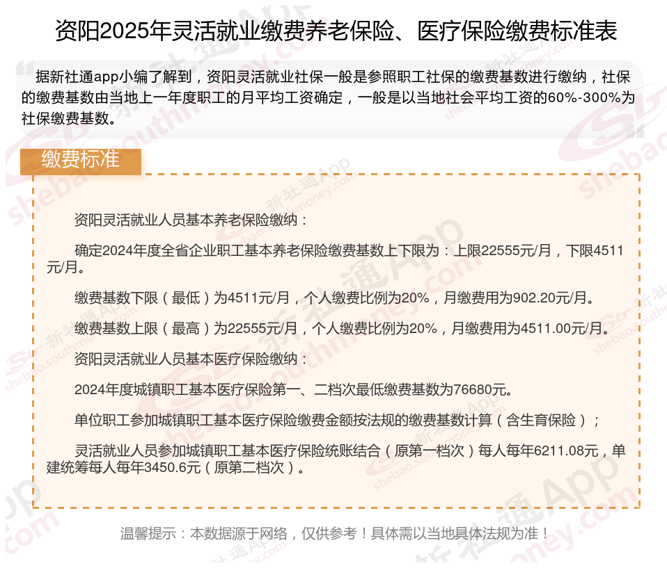 那么,打工人社保是多少钱一个月 资阳灵活社保交多少钱?根据新社通app-社保缴费查询工具提供的2025社保缴费标准详情数据: