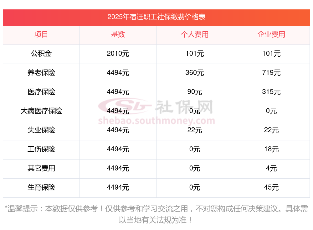 2025年宿迁社保缴费多少钱?宿迁社保公积金缴费基数为:3579.00元,个人比例 : 0.08,下表是2025宿迁社保费用明细参考,新社通app-社保缴费查询工具提供的最新数据如下: