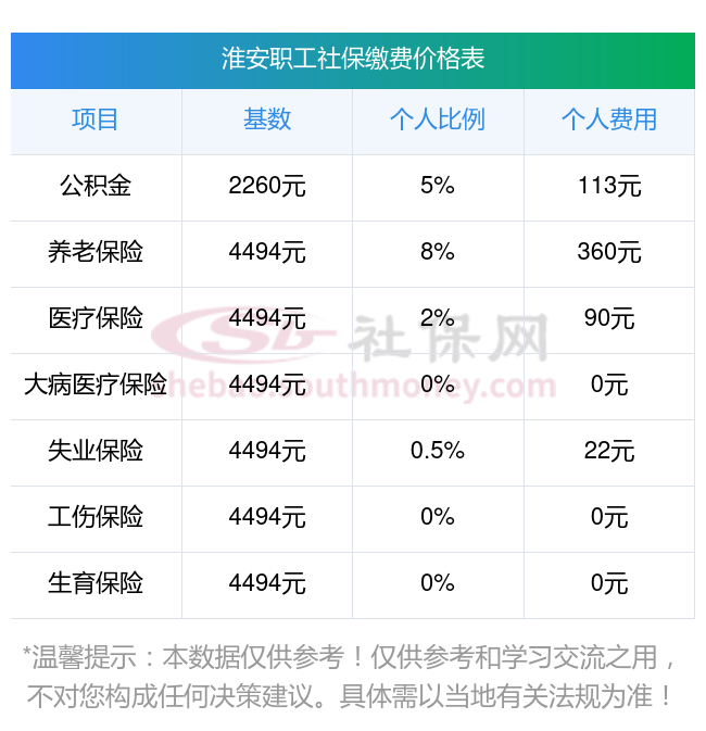 2025年社保多少钱一个月?下表是2024-2025年淮安社保费用明细参考,新社通app-社保缴费查询工具提供的最新数据如下: