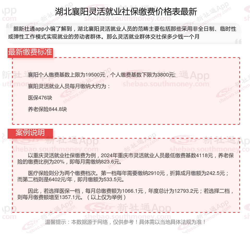 据新社通app数据显示,湖北襄阳灵活就业人员养老缴费基数2024-2025年最新标准如下: