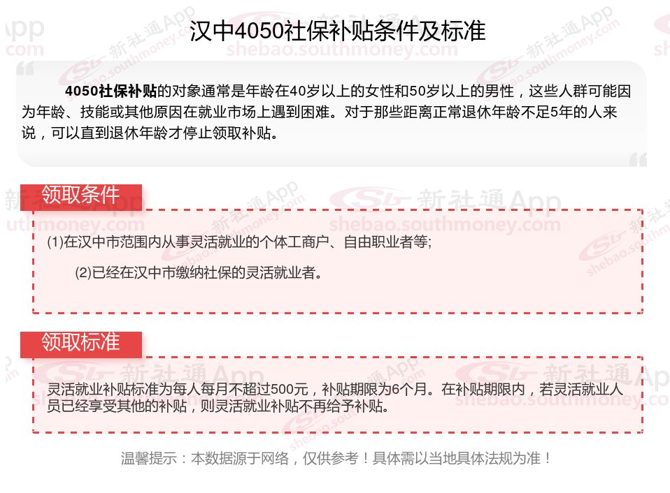 今天聊一下4050补贴的相关内容。4050补贴听起来像是一个针对特定年龄人群的社保补贴。比如女性需年满40周岁,男性需年满50周岁(以申请当年12月31日为截止日期)。那么汉中4050灵活就业困难人员社保补贴多少钱?汉中4050社保补贴可以申请吗?接下来随新社通APP小编具体了解一下4050社保补贴内容。