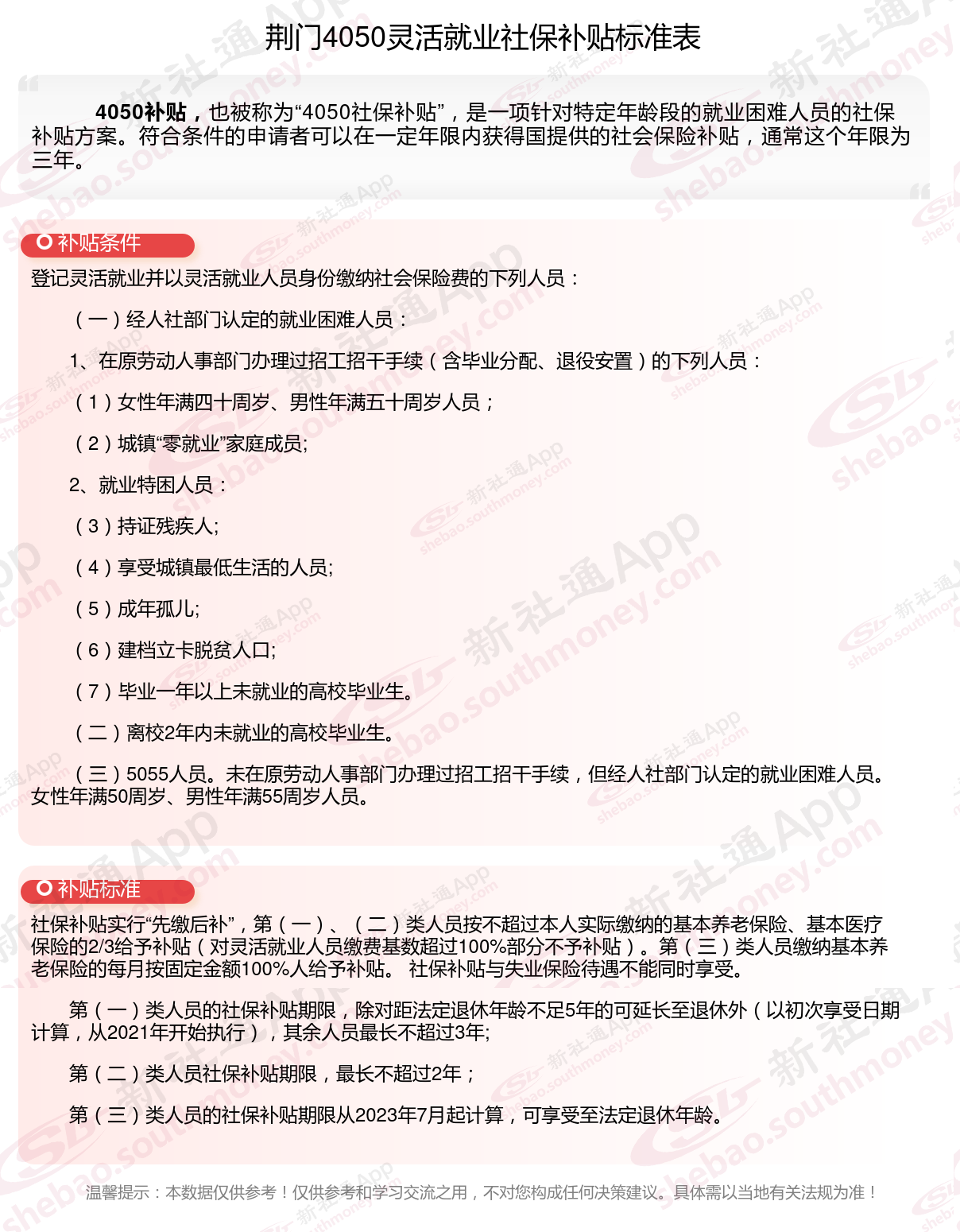 以上就是荆门4050灵活就业社保补贴的相关内容,欢迎关注新社通/下载新社通APP了解更多五险一金专业资讯。