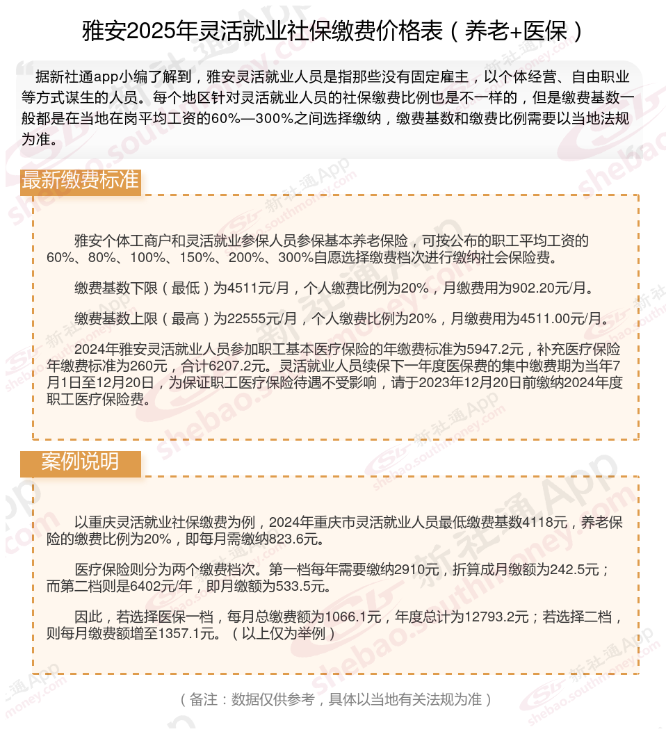 据新社通app数据显示,雅安灵活就业人员养老缴费基数2024-2025年最新标准如下: