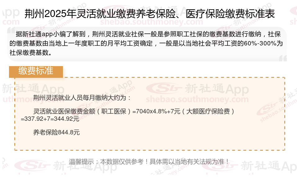 2025年荆州灵活就业缴费标准个人交多少呢, 个人是可以自己交社保的吗?根据新社通app-社保缴费查询工具提供的最新数据如下: