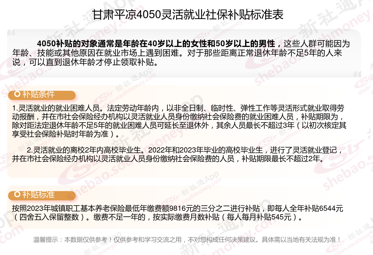 2025甘肃平凉灵活就业4050社保补贴是一项面向特定年龄段的就业困难人群的社会保险补贴。