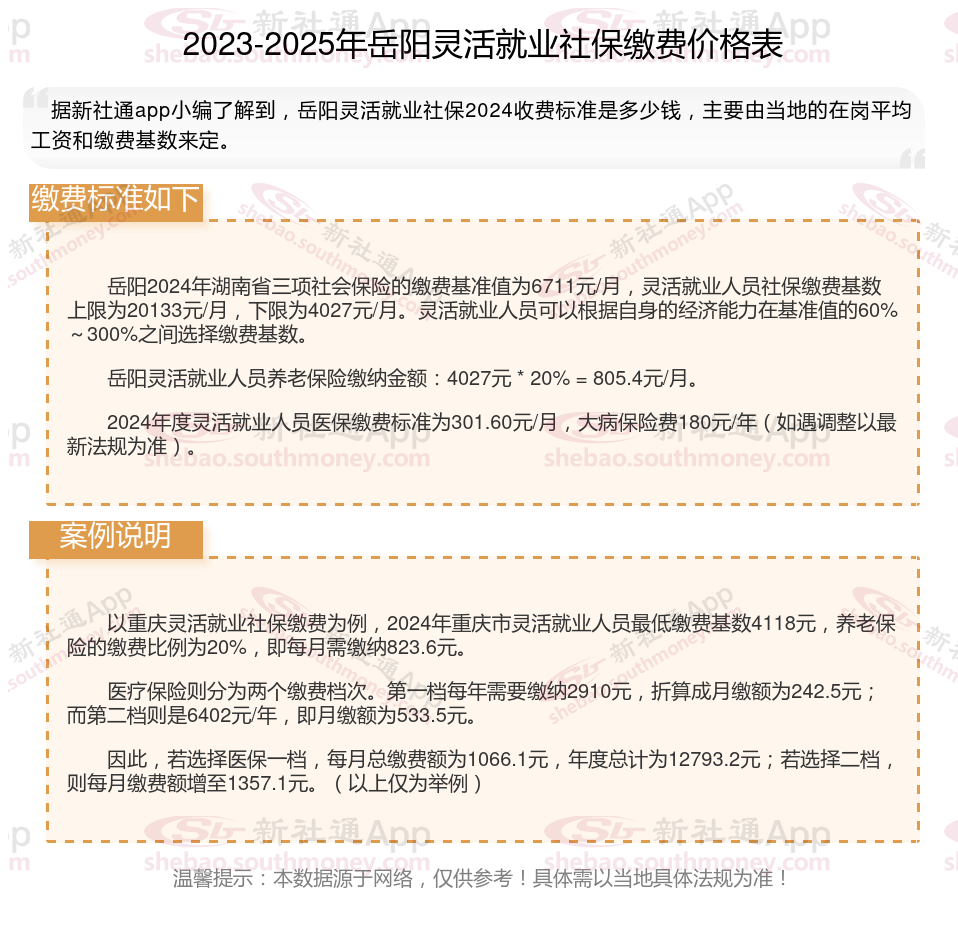 据新社通app数据显示,2024-2025年岳阳灵活就业人员养老保险的缴费标准: