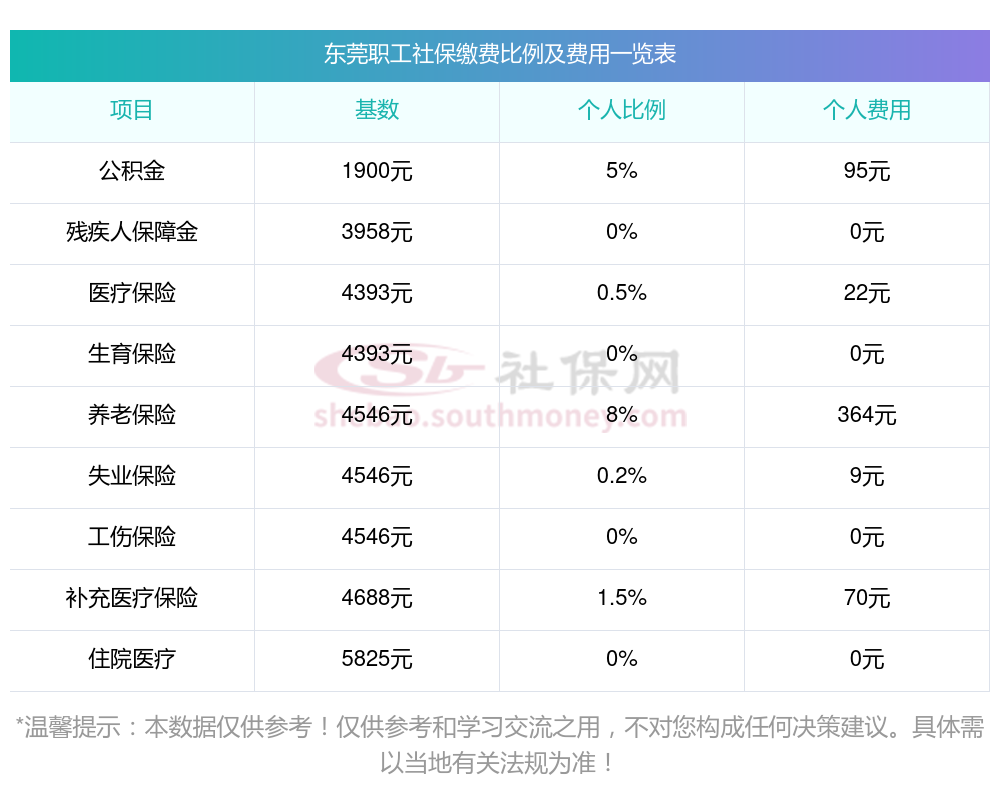 2025年东莞5险缴费标准,2025年东莞社保缴费多少钱?下表是2025年东莞社保费用明细参考,新社通app-社保缴费查询工具提供的最新数据如下: