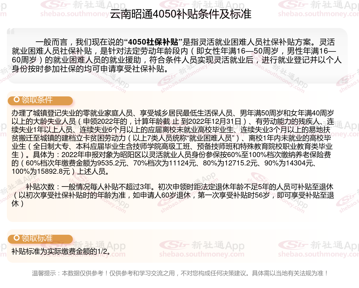 一、云南昭通4050社保补贴标准是什么?附条件