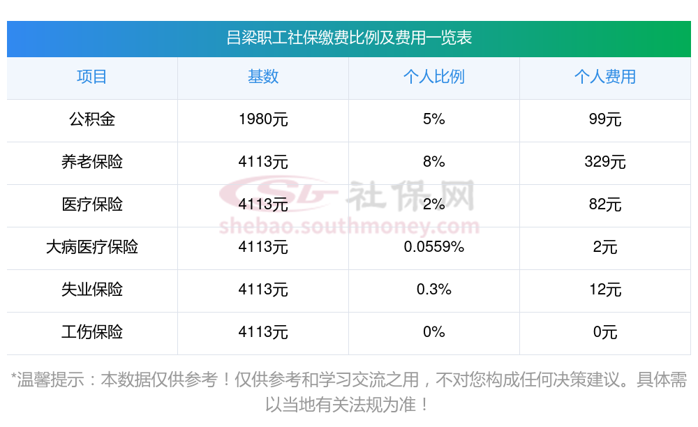 2025年吕梁社保缴费多少钱?下表是2023-2024年吕梁社保费用明细参考,新社通app-社保缴费查询工具提供的最新数据如下: