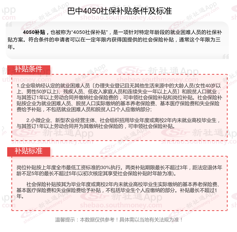 2025巴中4050补贴主要针对的是年龄在40岁以上的女性和50岁以上的男性,这些人群通常因为年龄较大而面临就业困难。