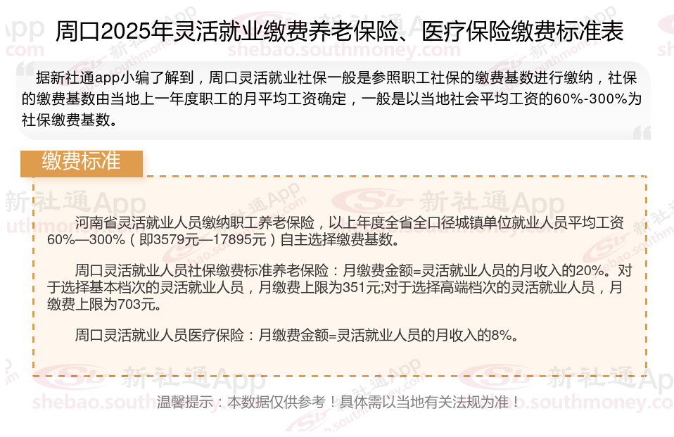 据新社通app数据显示,周口灵活就业养老保险的缴费基数为:3579元。灵活就业人员参保缴费的比例为个人20%。