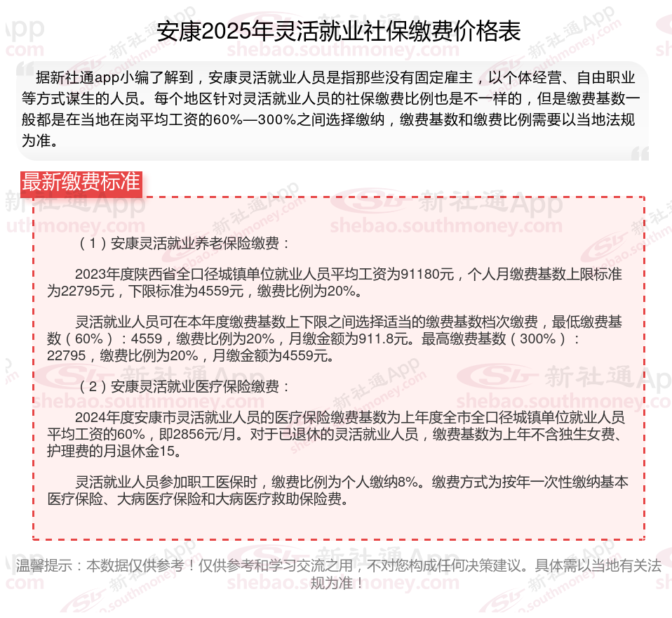 据新社通app数据显示,安康灵活就业养老保险缴费基数2024-2025年最新标准如下:
