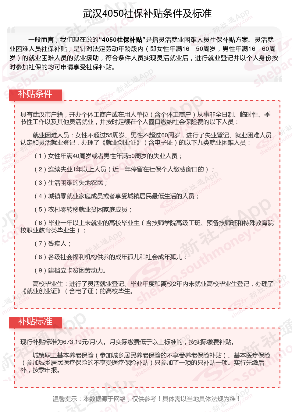 一、2025年武汉4050社保补贴标准及条件是多少?