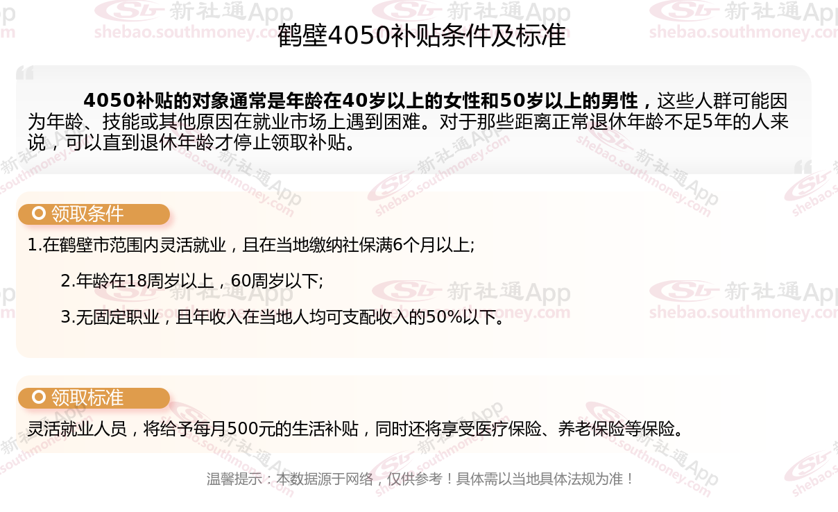 2025鹤壁灵活就业4050社保补贴是一项面向特定年龄段的就业困难人群的社会保险补贴。