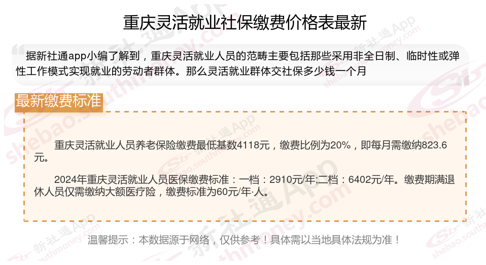 据新社通app数据显示,2024-2025年重庆灵活就业人员养老保险的缴费标准是根据缴费基数来确定的: