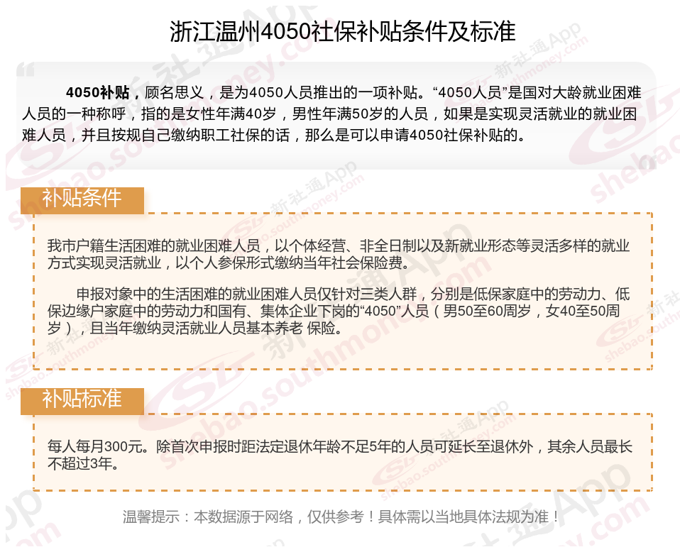 4050社保补贴标准据新社通app小编了解,通常,4050社保补贴包含基本医疗保险和基本养老保险两个险种,社保补贴金额为申请人实际缴纳基本养老保险和基本医疗保险金额的2/3,具体标准以当地社保局公布的数据为准!那么浙江温州4050灵活就业困难人员社保补贴标准是多少?浙江温州4050社保补贴需要符合什么条件?接下来随新社通APP小编具体了解一下4050社保补贴内容。