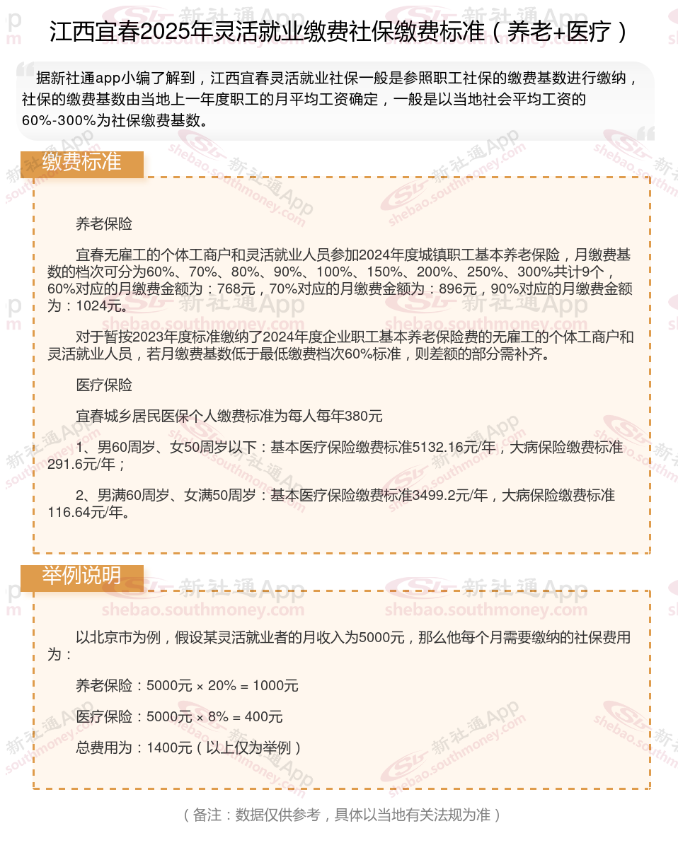 那么,江西宜春灵活就业人员社保缴费标准2024-2025最新来了,交社保有什么好处?根据新社通app-社保缴费查询工具提供的2025社保缴费标准详情数据: