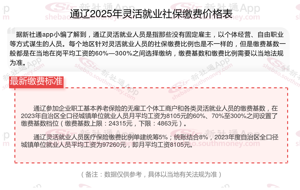 那么,自由职业者社保是多少钱一个月 通辽灵活社保交多少钱?根据新社通app-社保缴费查询工具提供的2025社保缴费标准详情数据: