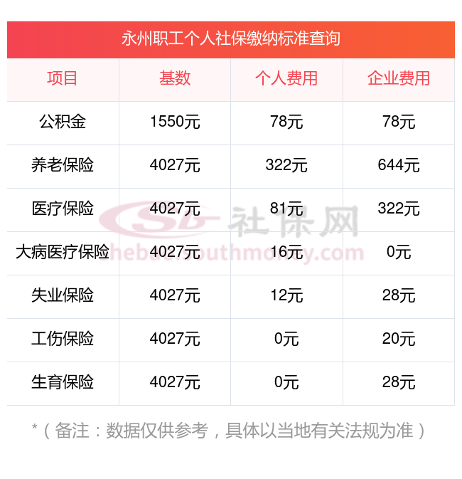 职工五险一个月交多少钱 公司加个人是多少?下表是2024-2025年永州社保费用明细参考,新社通app-社保缴费查询工具提供的最新数据如下: