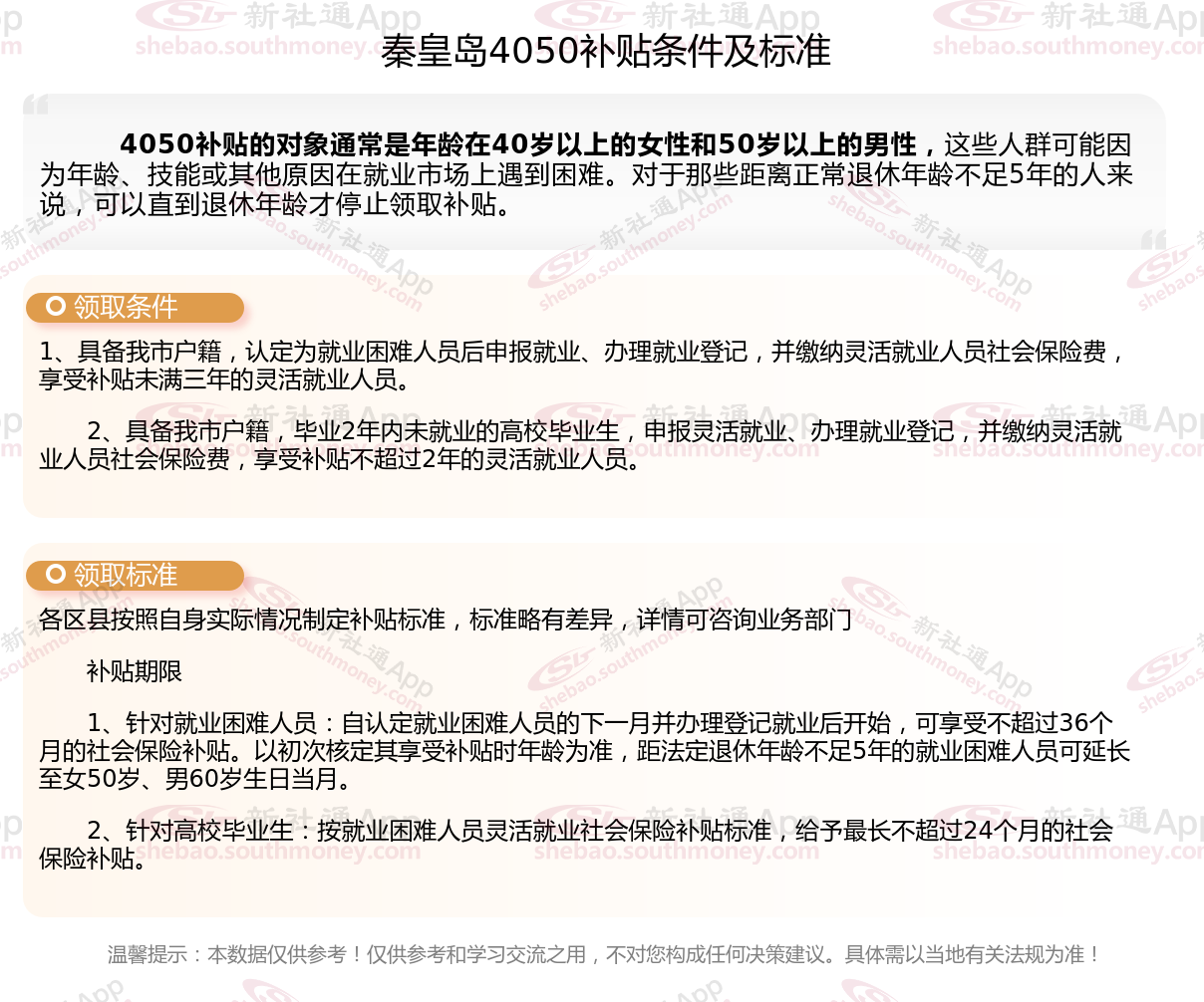 一、最新秦皇岛4050社保补贴标准及条件