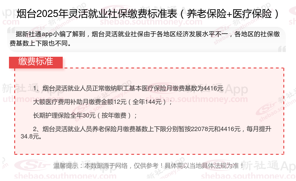 据新社通app数据显示,烟台灵活就业养老保险缴费基数2024-2025年最新标准如下: