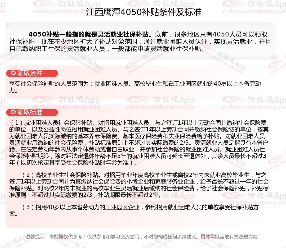 2025江西鹰潭4050补贴主要针对的是年龄在40岁以上的女性和50岁以上的男性,这些人群通常因为年龄较大而面临就业困难。