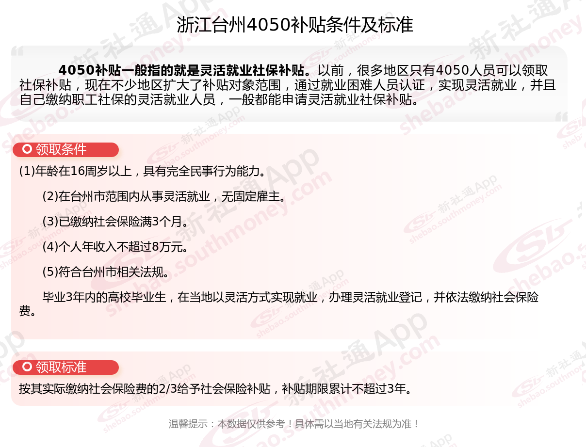 二、2025年浙江台州4050社保补贴多少钱?4050社保补贴领取条件什么?