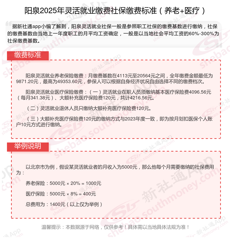 阳泉灵活就业社保缴费标准,阳泉社保缴费多少钱?下表是2024-2025年阳泉社保费用明细参考,根据新社通app-社保缴费查询工具提供的最新数据如下: