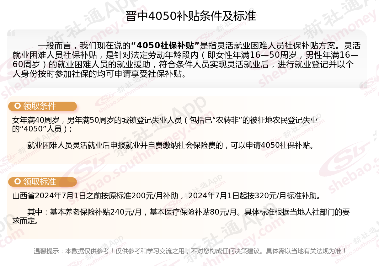 2025晋中4050补贴主要针对的是年龄在40岁以上的女性和50岁以上的男性,这些人群通常因为年龄较大而面临就业困难。