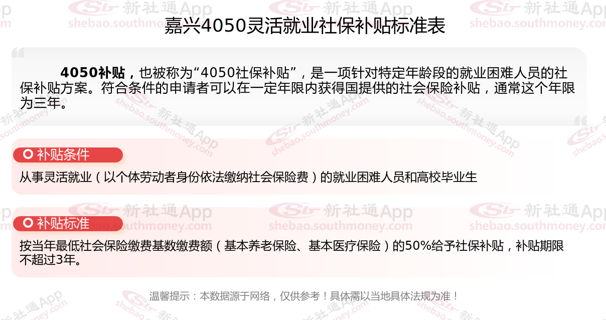 二、嘉兴灵活就业4050社保补贴标准及条件是什么
