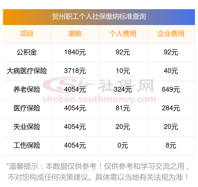 2025年贺州社保缴费多少钱?下表是2023-2024年贺州社保费用明细参考,新社通app-社保缴费查询工具提供的最新数据如下: