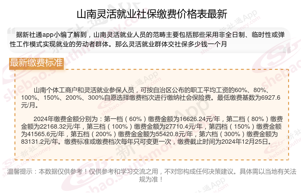 以上就是带来山南灵活就业社保缴费标准相关知识,内容供参考,希望对你有帮助,欢迎关注/下载新社通APP解锁更多社保专业资讯。