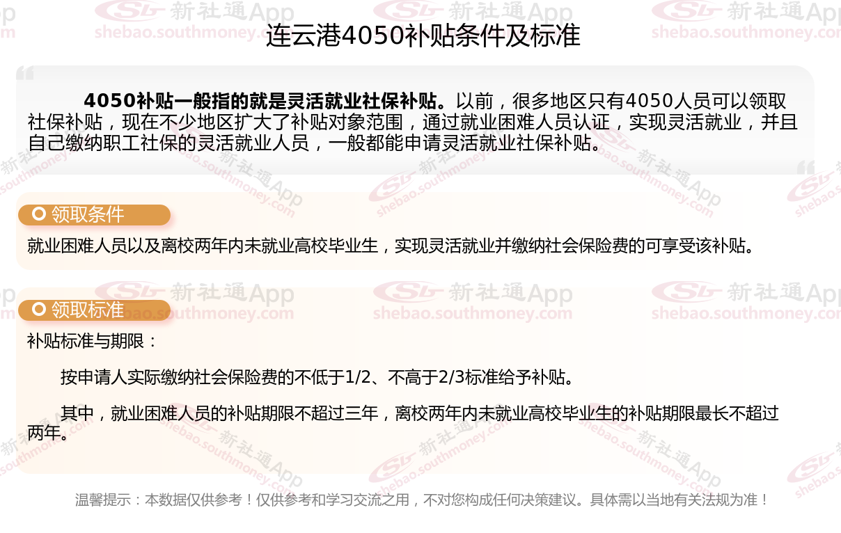 4050补贴需要以灵活就业身份参加职工养老和医疗保险,补贴标准不超过实际缴费的三分之二,最长3年,距离退休不足5年的可延长到退休。补贴对象包括国企下岗人员、低保家庭等。申请流程需要提交身份证、银行账户等。那么连云港4050灵活就业社保补贴标准是多少钱?连云港4050社保补贴条件是什么?接下来随新社通APP小编了解一下最新资讯。