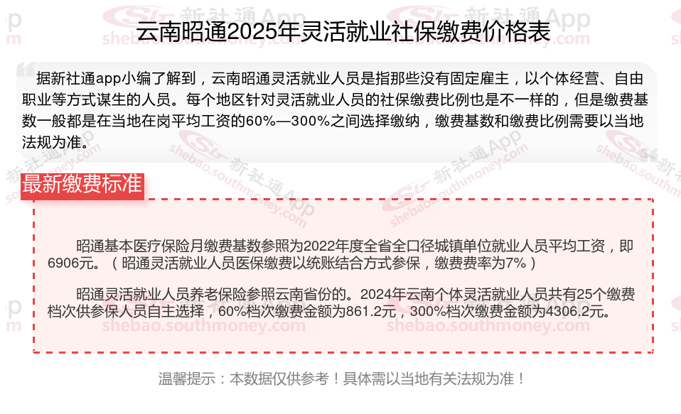 云南昭通灵活就业人员社保每月交多少钱?根据新社通app-社保缴费查询工具提供的最新数据如下: