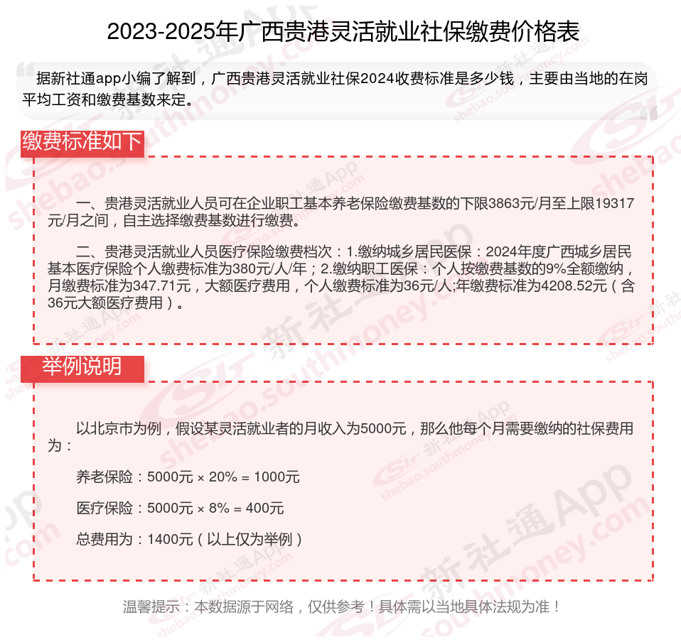 据新社通app数据显示,2024-2025年广西贵港灵活就业人员养老保险的缴费标准: