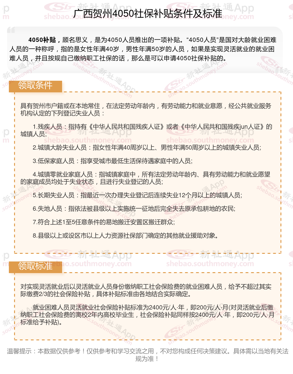 一、广西贺州4050社保补贴标准及条件2025年最新消息