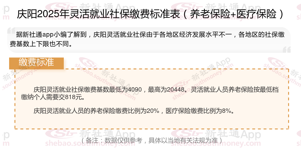 据新社通app数据显示,2024-2025年庆阳灵活就业人员养老保险的缴费标准: