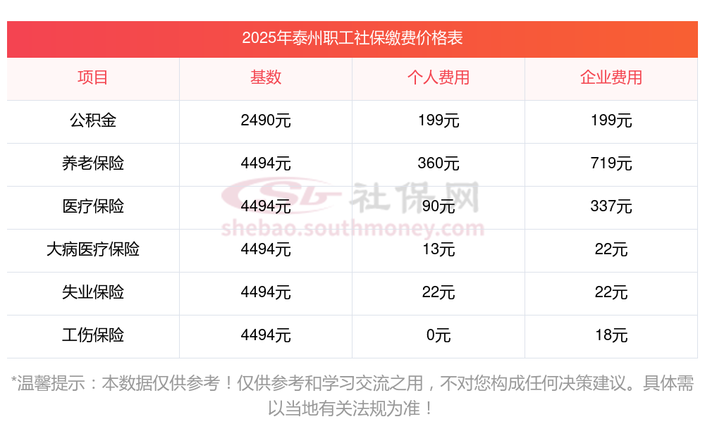 2025年泰州五险缴费标准是多少,2025年泰州社保缴费多少钱?下表是2025年泰州社保费用明细参考,新社通app-社保缴费查询工具提供的最新数据如下: