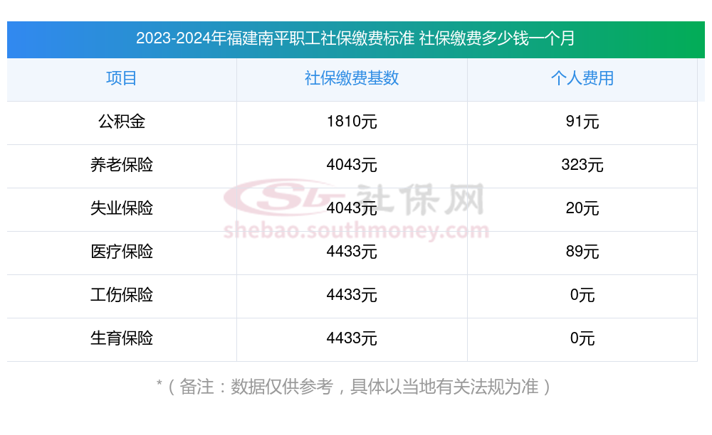 2025年福建南平5险缴费标准是多少,2025年福建南平社保缴费多少钱?下表是2025年福建南平社保费用明细参考,新社通app-社保缴费查询工具提供的最新数据如下: