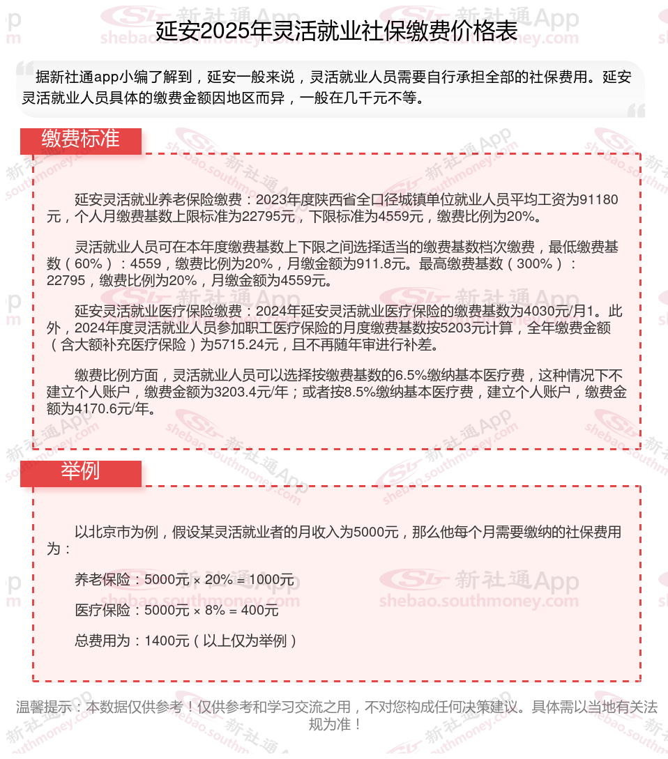据新社通app数据显示,2024-2025年延安灵活就业人员养老保险的缴费标准是根据缴费基数来确定的: