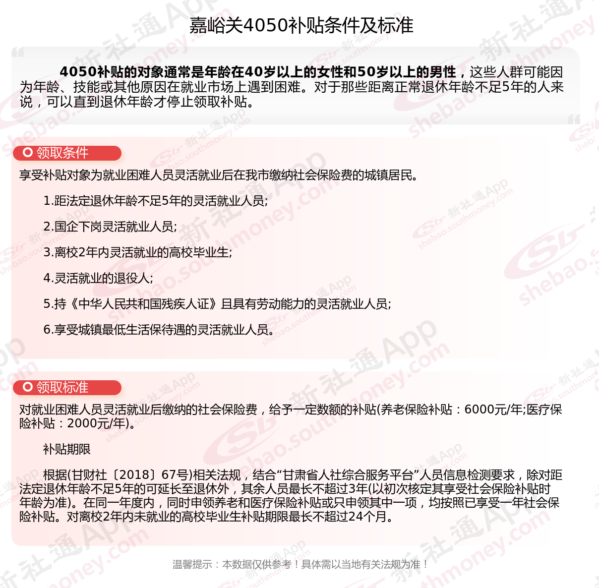 二、嘉峪关4050社保补贴标准及条件2025年最新消息