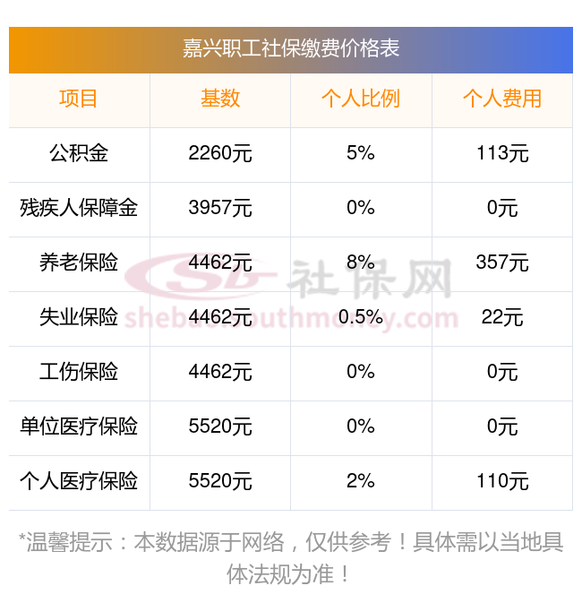 2025年社保缴费价目表,下面和社保小编一起来了解下2024-2025年嘉兴最低配社保费用明细参考,新社通app-社保缴费查询工具提供的最新数据如下: