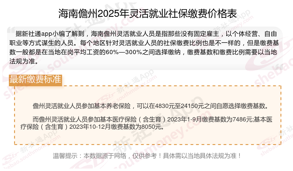 而儋州灵活就业人员参加基本医疗保险(含生育)2023年1-9月缴费基数为7486元;基本医疗保险(含生育)2023年10-12月缴费基数为8050元。