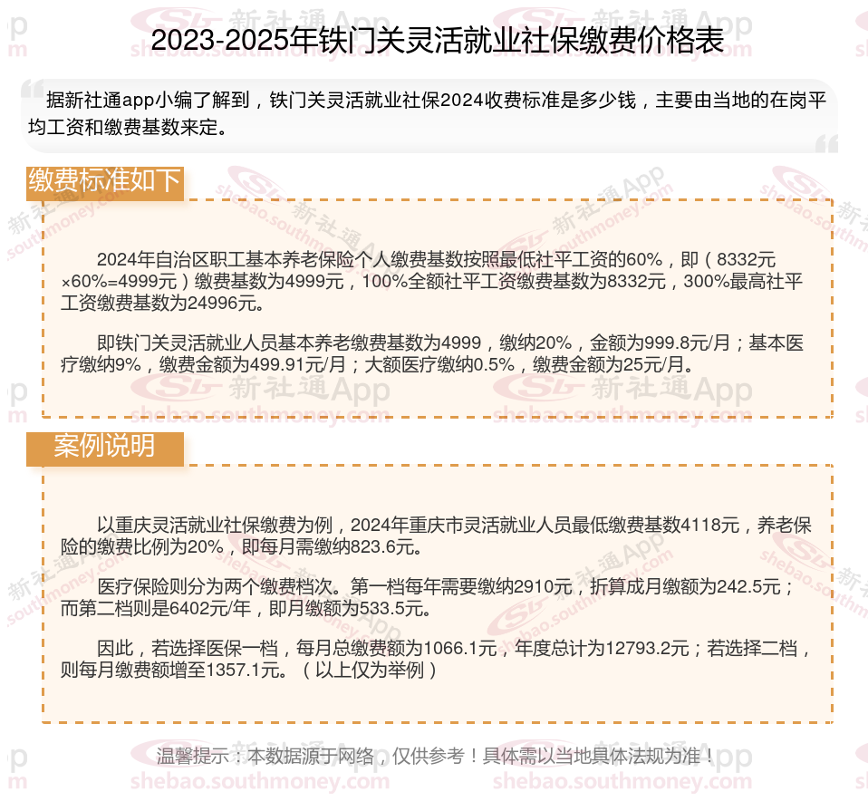 铁门关灵活就业人员基本养老保险缴费基数暂按不低于4999元;