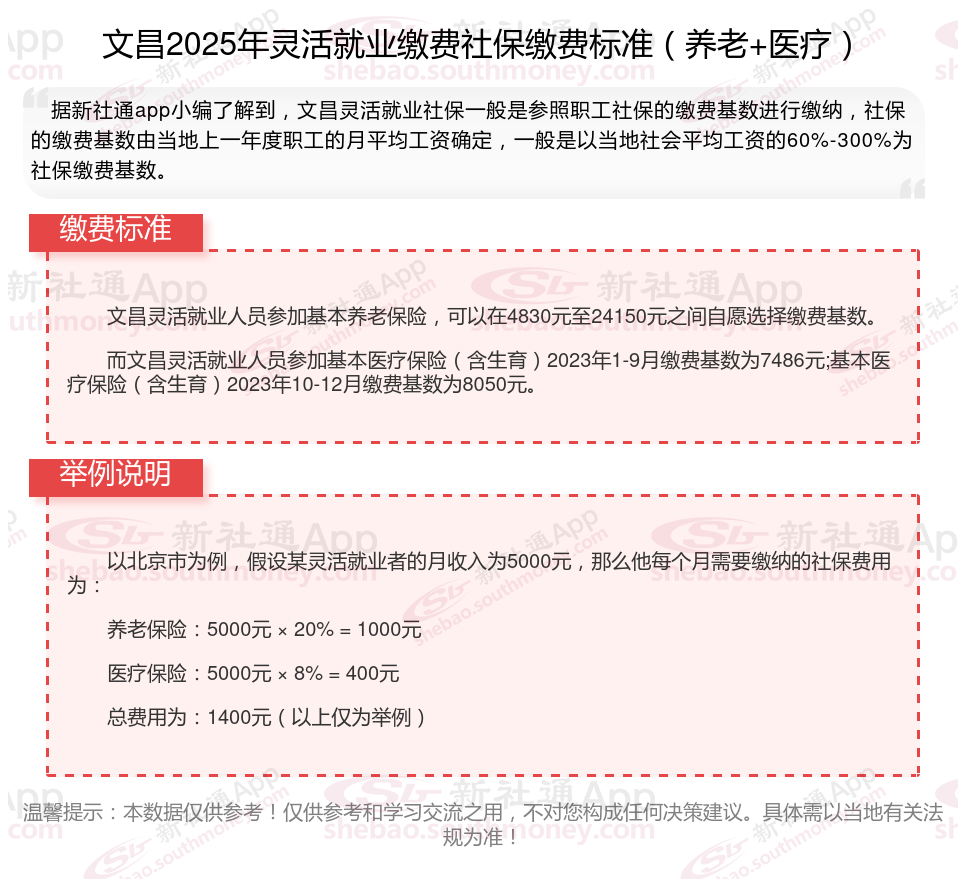 而文昌灵活就业人员参加基本医疗保险(含生育)2023年1-9月缴费基数为7486元;基本医疗保险(含生育)2023年10-12月缴费基数为8050元。