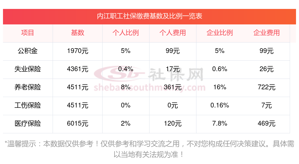 内江五险最少要交多少钱一个月多少钱?下表是2024-2025年内江社保费用明细参考,新社通app-社保缴费查询工具提供的最新数据如下: