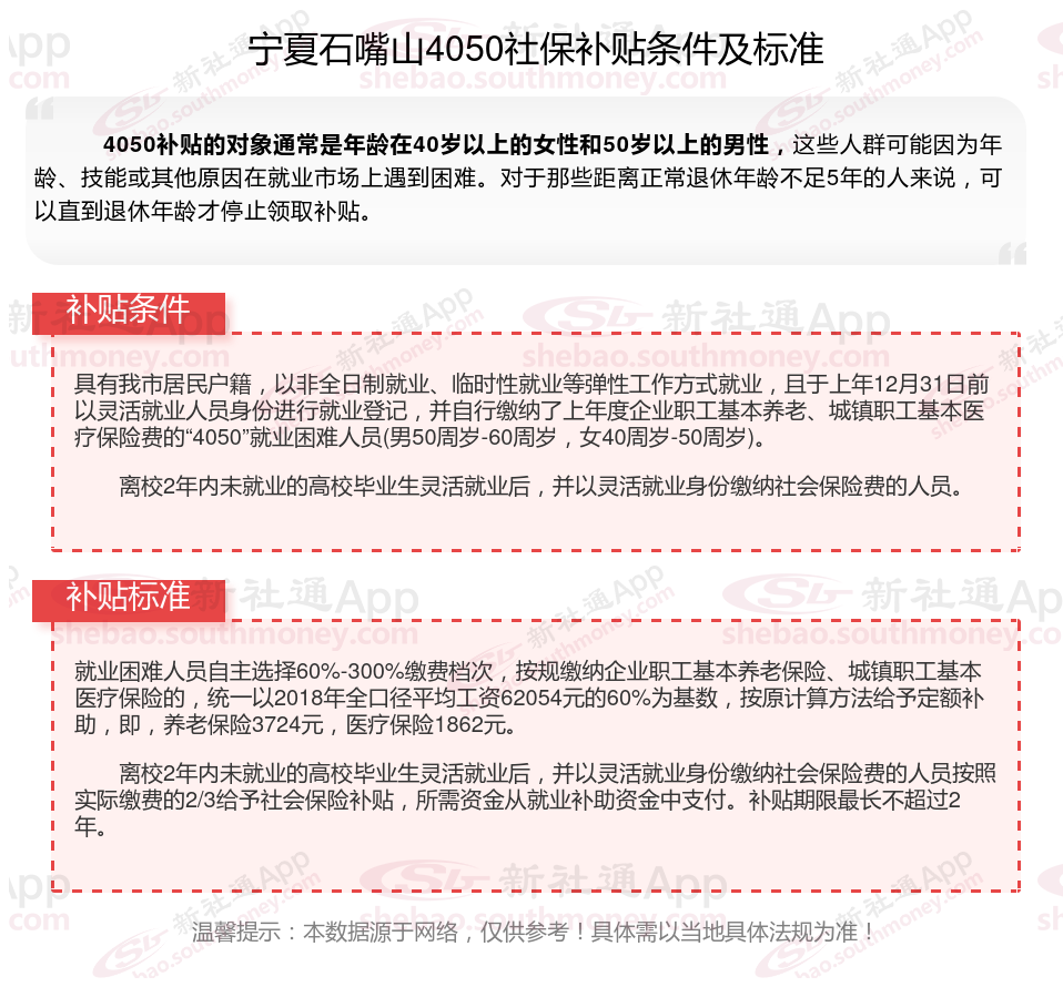 以上就是宁夏石嘴山4050灵活就业社保补贴的相关内容,欢迎关注新社通/下载新社通APP了解更多五险一金专业资讯。