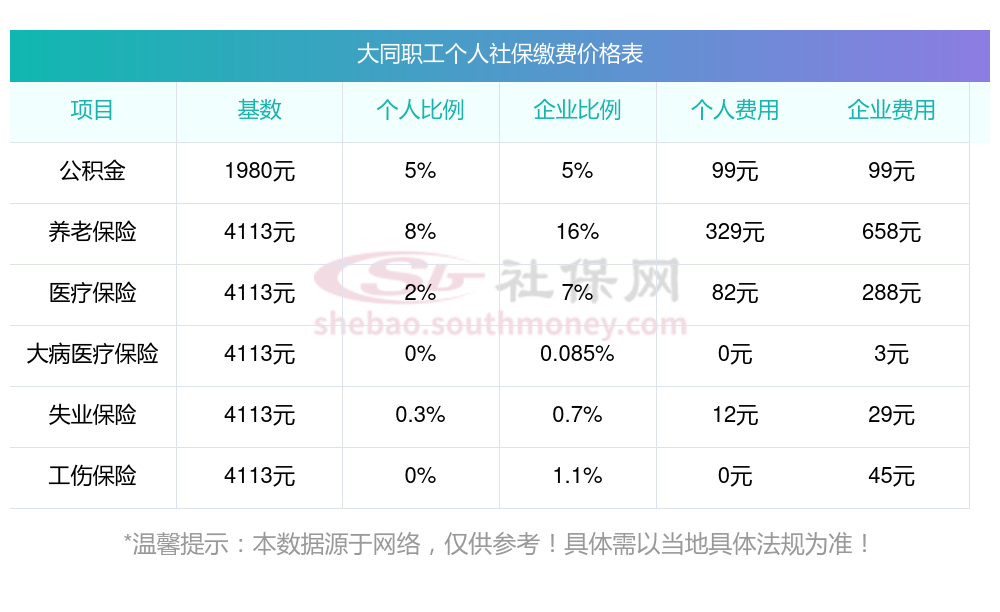 2025年大同五险缴费标准是多少,2025年大同社保缴费多少钱?下表是2025年大同社保费用明细参考,新社通app-社保缴费查询工具提供的最新数据如下:
